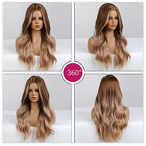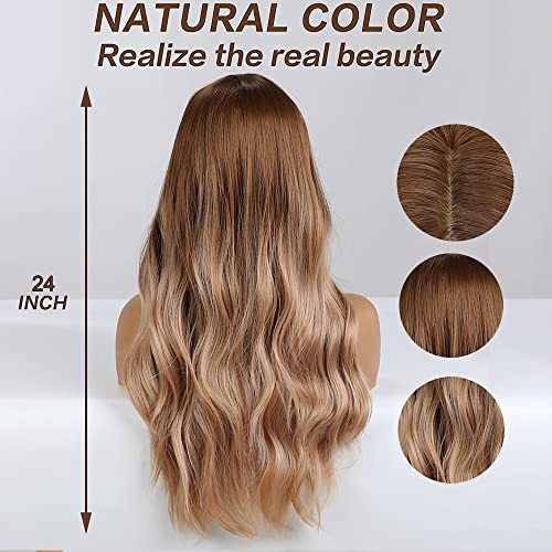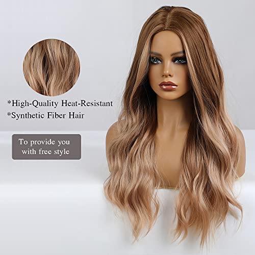 Esmee Parrucca marrone sfumato oro da 24 pollici,parrucca sintetica resistente al calore a ricci lunghi da donna.