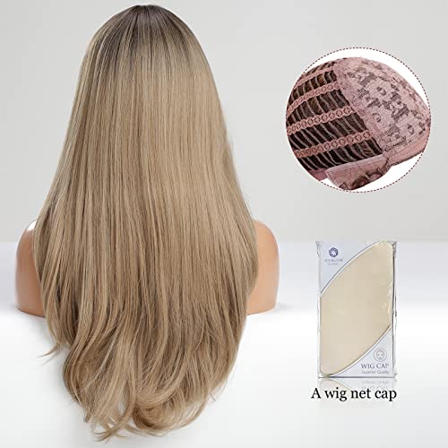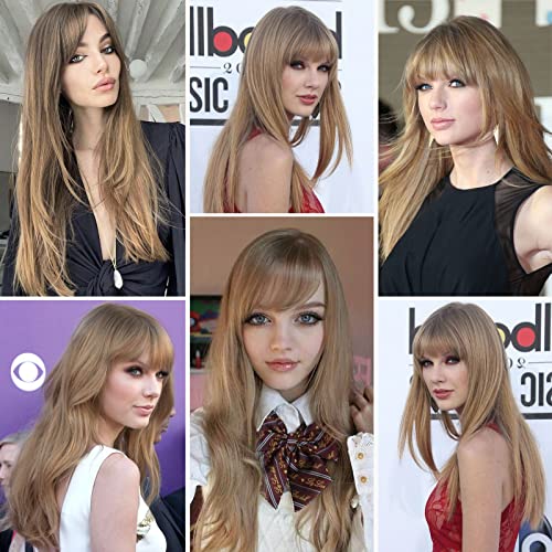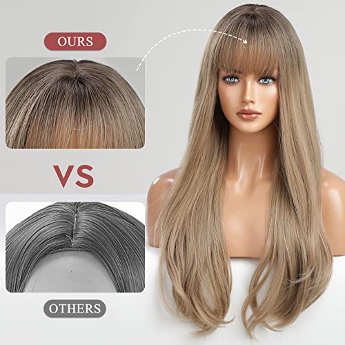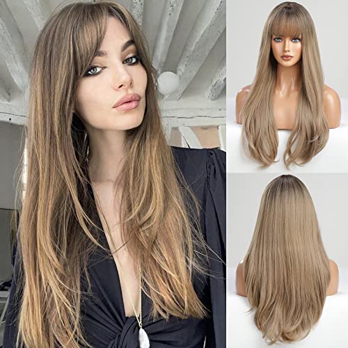 HAIRCUBE Lungo diritto con frange Parrucche per le Donne Natura Resistente al calore Fibra sintetica Parrucche con Pony Cosplay quotidiano (radice scura ombre marrone miele)